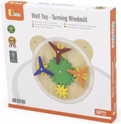 Pět barevných ozubených kol a tři větrníčky jsou vzájemně propojené. Dítě pochopí princip příčiny a následku, když jedním pohybem roztočí celý mechanismus.