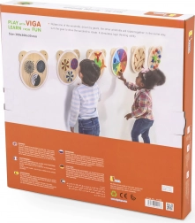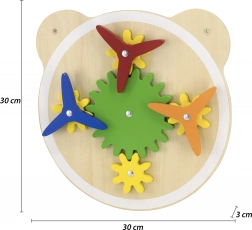 Dřevěná tabule ve tvaru hlavy medvídka kombinuje pět propojených ozubených kol a tři větrníčky. Děti si hrou osvojují princip příčiny a následku: po otočení jednoho kola se rozpohybují všechna. Přirozeně tak trénují jemnou motoriku, vizuální vnímání a týmovou spolupráci, když se střídají u jednoho panelu.