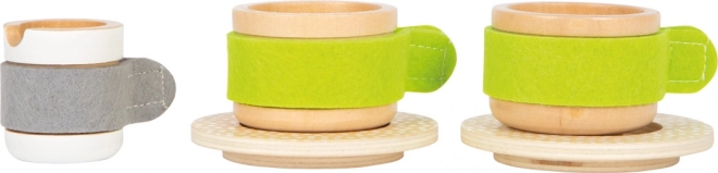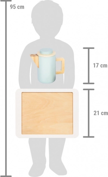 Zažijte radost z přípravy čaje a kávy s naším herním setem. Tento krásně zpracovaný dřevěný set nabízí mnoho detailů, které podněcují představivost. Sada obsahuje dva šálky a podšálky, dvě lžičky, cukřenku, konvičku na mléko a velkou konvici na kávu nebo čaj s odnímatelnými víky, které přidávají na realističnosti hry.