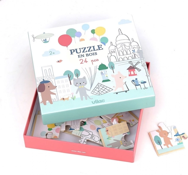 Objevte kouzlo Paříže s kvalitními dřevěnými puzzle od značky Vilac, ilustrovanými Sarah Betz. Tyto panoramatické dřevěné puzzle s 24 dílky rozvíjejí jemnou motoriku, pozorování a koncentraci dětí již od 2 let. Díky odolnému materiálu a inspiraci Montessori přístupem jsou ideální pro společné učení i zábavu.