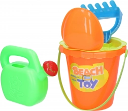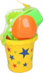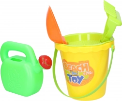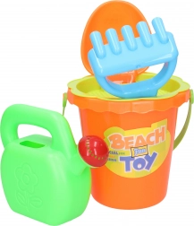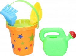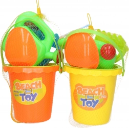 Praktická dětská sada na písek o velikosti 15 cm obsahuje vše, co malí stavitelé potřebují: kyblík, sítko, konvičku, hrábě a lopatku. K dispozici jsou 2 barevné varianty – žlutá a oranžová. Skvělé pro hřiště, pláž i zahradu.