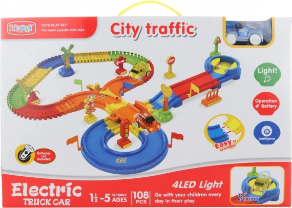 Tato dráha s autíčkem je vyrobena z kvalitního plastu a je navržena pro děti již od 18 měsíců věku. Po vložení 1 AA baterie (není součástí balení) se autíčko rozsvítí a začne jezdit po dráze. Sada obsahuje celkem 108 dílů, což umožňuje sestavení různorodých tvarů a tratí, které budou děti poznávat. Díky své velikosti je dráha snadno přenosná a dá se snadno uložit či rozložit podle potřeby.