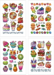 Ozdobte své tělo krásným barevným tetováním s motivy oblíbených cukrovinek. Snadné použití a odstranění! 4 listy tetování nabízejí široký výběr designů.