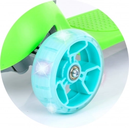 Přední (12 cm) i zadní (8 cm) kola mají barevné LED diody, které se rozsvítí při jízdě a zvyšují viditelnost dětí za šera.