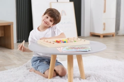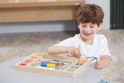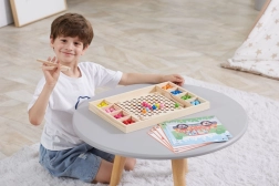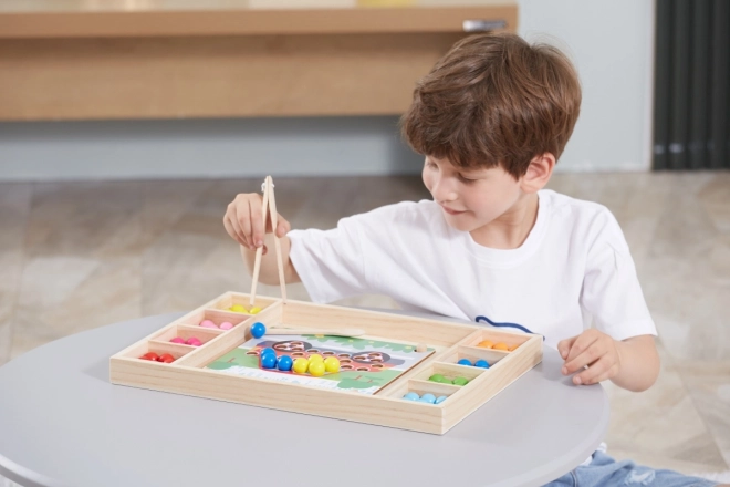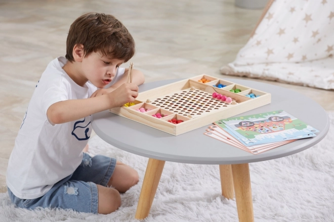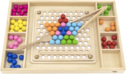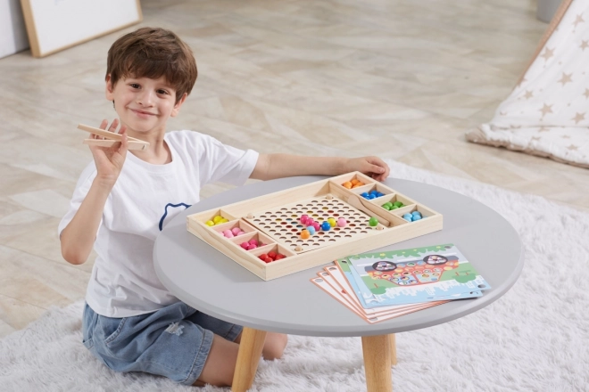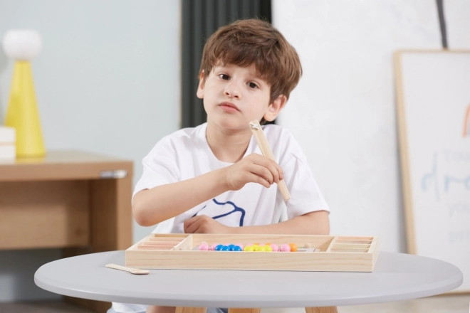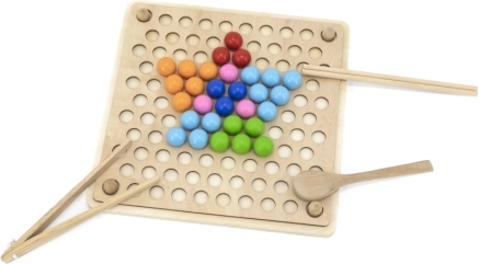 Dřevěná vzdělávací hra "Chyť a Seřaď" umožňuje dětem vyzkoušet různé vzory a barvy dle přiložených papírů nebo jejich vlastní fantazie. S touto hrou děti mají možnost připevnit papír na dřevěný podnos a za použití dřívek, lžíce nebo klipu vkládat barevné koule do otvorů na desce. Nakonec děti mohou vytvořit krásné obrázky.
