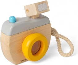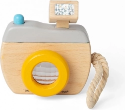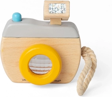 Výrazný objektiv, horní „blesk“ a funkční tlačítko přinášejí dětem autentický zážitek z focení. Kvalitní dřevo a zaoblené hrany zajišťují bezpečnou hru bez ostrých částí.