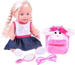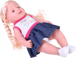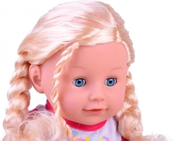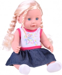 Tato půvabná panenka o výšce přibližně 40 cm je vyrobena z bezpečného, kvalitního materiálu a zaujme realistickými detaily obličeje i jemným úsměvem. Dlouhé blond vlasy zapletené do copánků vybízejí k česání a stylingu, modré oči se zavíracím mechanismem dodávají hře na autentičnosti.
