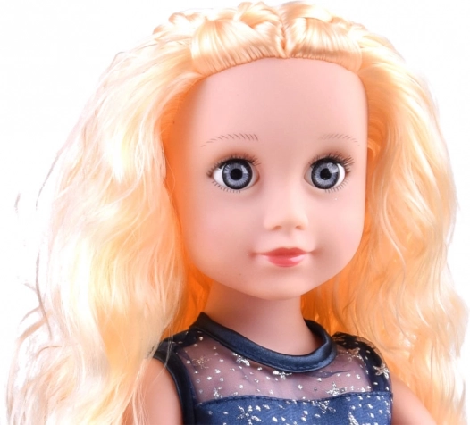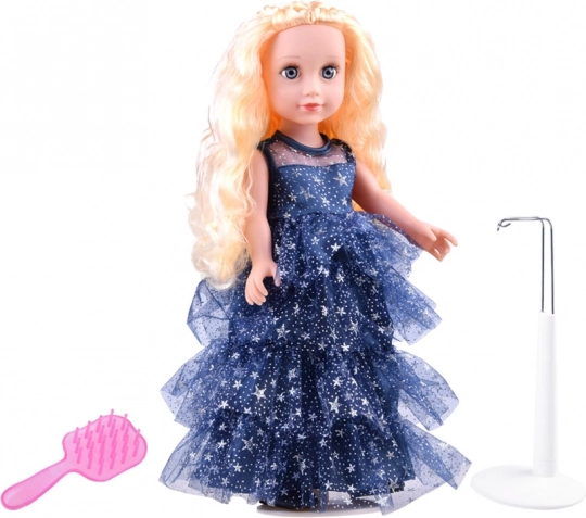 Elegantní panenka s dlouhými blond vlasy v nádherných modrých šatech posetých hvězdami přináší hodiny kreativní zábavy. Má pohyblivé ruce, nohy i hlavu, je celá z odolného plastu a součástí je stojánek a hřeben pro snadné česání a vystavení.