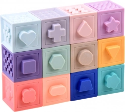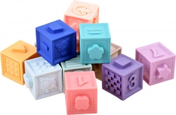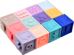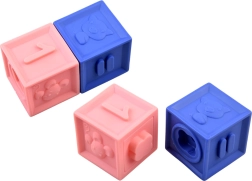 Kostky jsou vyrobeny z poddajného, netoxického materiálu, který je příjemný na dotek, bezpečný pro kousání a vhodný od 3 měsíců.