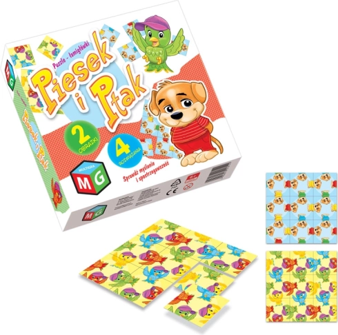 Skládačka "Pes a Pták" je ideální hračka pro rozvíjení logického myšlení a pozorovacích schopností. Obsahuje 9 tabulek, které skládáte do 3x3 čtverce tak, aby sousedící tabulky ladily barvou a tvarem.