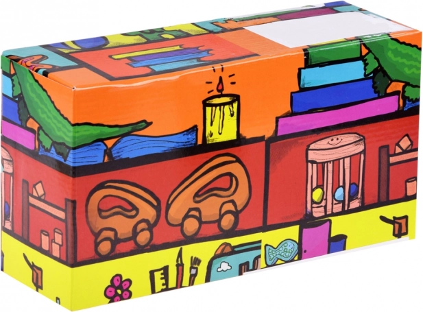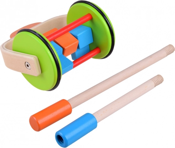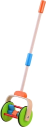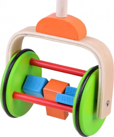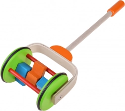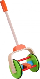Barevná dřevěná hračka k tlačení je navržena tak, aby podporovala děti při jejich prvních krůčcích. Má rukojeť přizpůsobenou výšce dítěte s možností regulace. Kola jsou pokryta gumovým páskem, což zajišťuje hladký pohyb a ochranu podlahy.