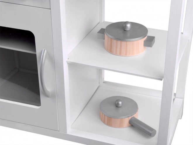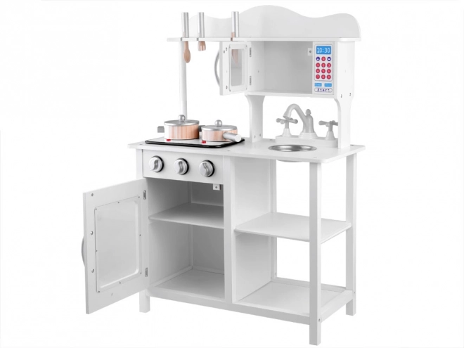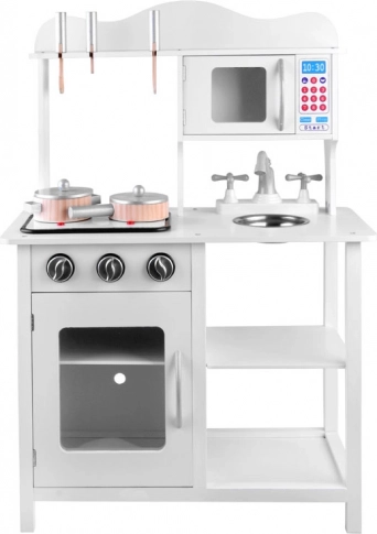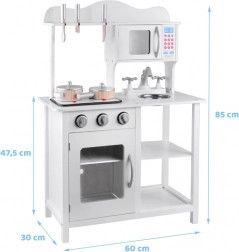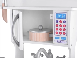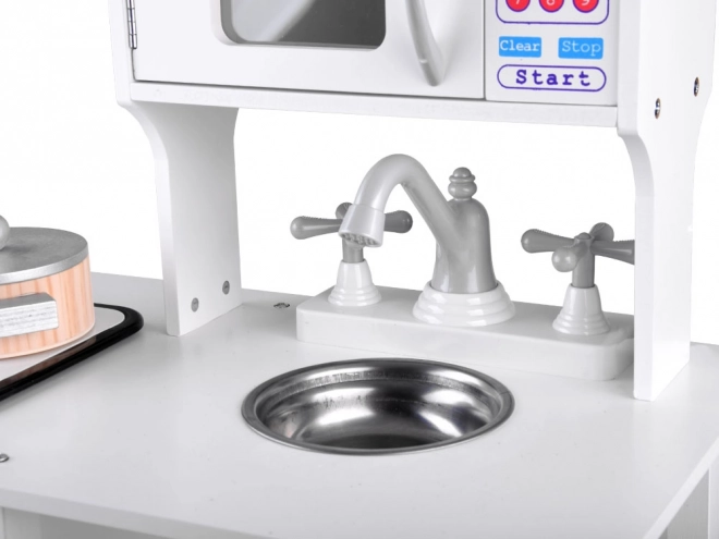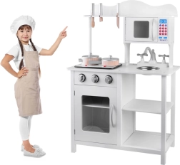 Stylová bílá dřevěná dětská kuchyňka pro malé kuchaře s indukční deskou se světly a zvuky, kovovým dřezem, mikrovlnkou a bohatým příslušenstvím. Podporuje kreativitu, představivost i jemnou motoriku a nabídne hodiny zábavy při hře na vaření.