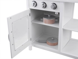 Otevírací mikrovlnka, skříňka s policí a magnetickými dvířky, otevřená polička a praktické náčiní podněcují kreativní hru a udržují pořádek v kuchyňce.