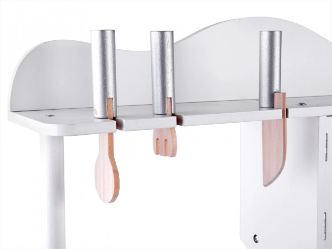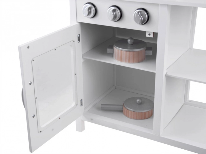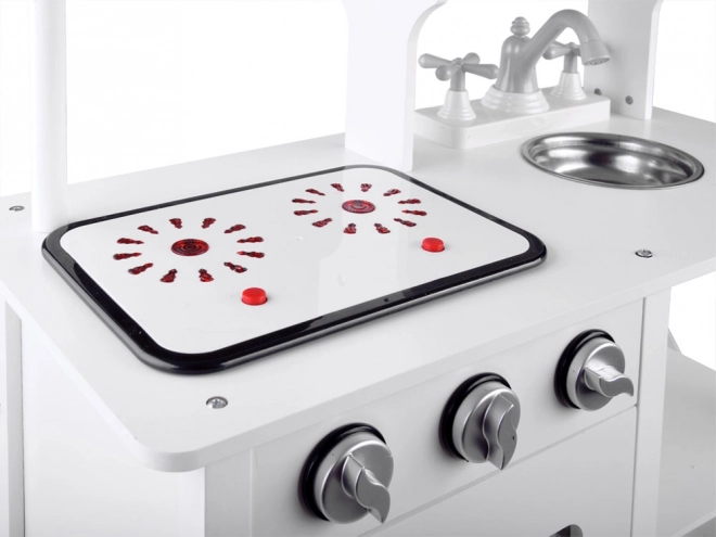 Tato elegantní bílá kuchyňka z dřeva a MDF přináší dětem realistický zážitek z vaření. Interaktivní varná deska imituje vroucí vodu světelnými a zvukovými efekty, otočné knoflíky příjemně „cvakají“ a kovová miska ve dřezu se snadno vyjímá pro pohodlné čištění. Kvalitní materiály a povrch s netoxickými barvami zajišťují bezpečnou a odolnou hračku.