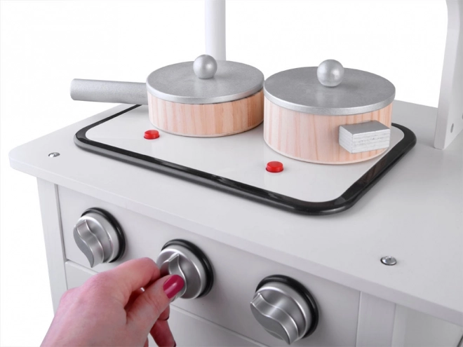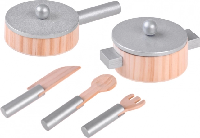 - Dřevěné příslušenství: hrnec s poklicí, pánev s poklicí, dřevěný nůž, lžíce a vidlička.