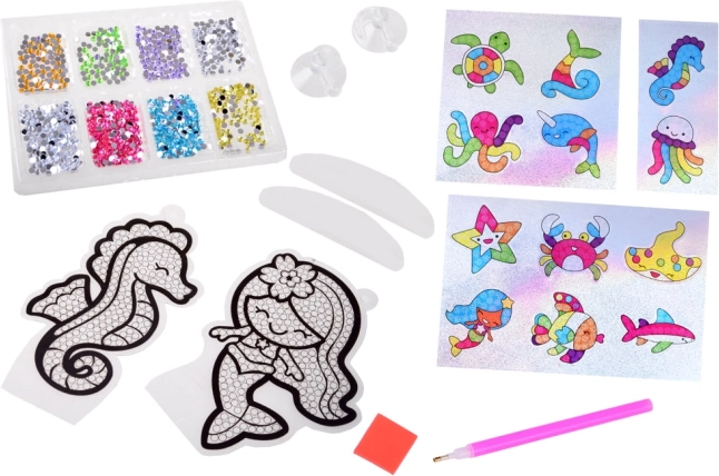 Vytvořte třpytivé samolepky a dva závěsné obrázky s mořskými přáteli. Hotové výtvory snadno postavíte na podstavce nebo zavěsíte přísavkami s háčky.