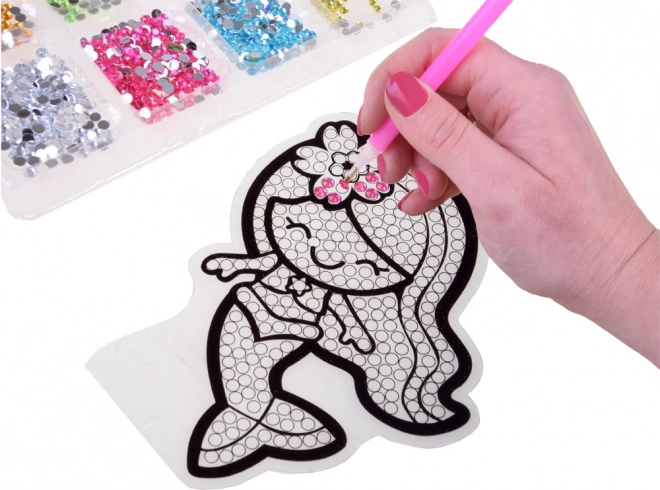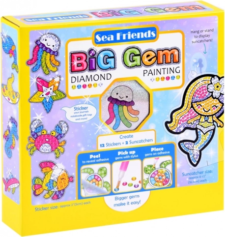 Tato sada Diamantové malování Sea Friends umožní dětem vytvořit třpytivé obrázky mořských kamarádů. Stačí odlepit ochrannou fólii, nabrat kamínek aplikátorem s voskem a podle barev umístit na samolepku či šablonu s lepidlem. Pokud se kamínek přilepí špatně, můžete jej před zaschnutím snadno přemístit.