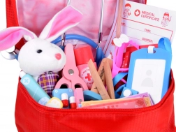Upozornění: všechny prvky jsou rekvizity. Během hry nevkládejte „léky“ ani jiné drobné díly do úst. Barva/vzor plyšového králíčka se může lišit.
