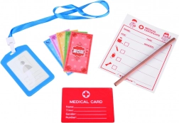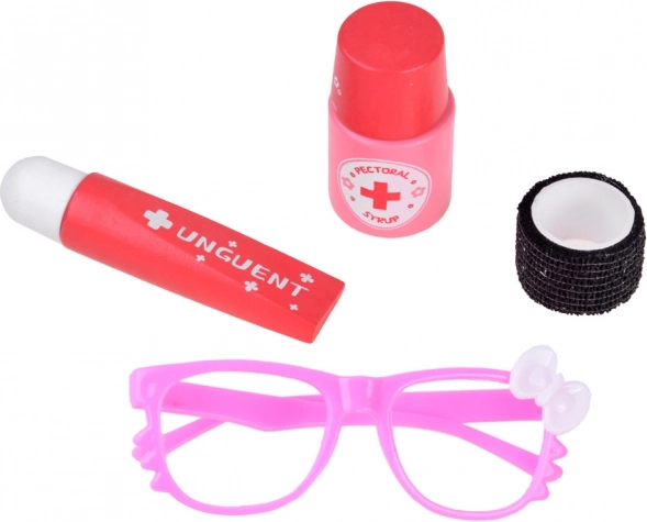 Součástí je i termočlánek/teploměr s vyměnitelnými disky, stříkačka, nůžky, pinzeta, obvaz, náplasti, „léky“ v tabletách a kapslích (rekvizity), sirup a mast v tubě, karty pacienta a lékařský průkaz. Vše se snadno ukládá do odolné červené lékárničky s uchem, takže je sada ideální i na cesty a rychlé zásahy.