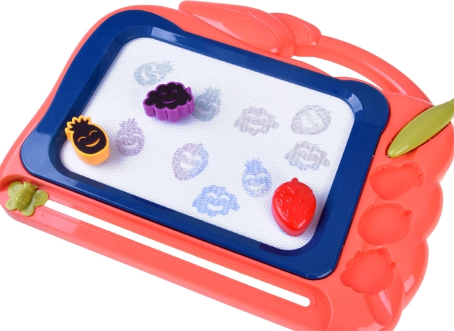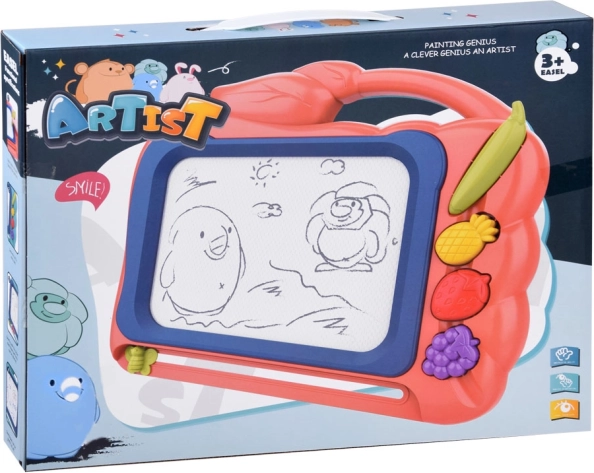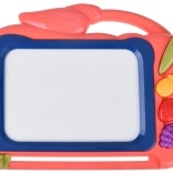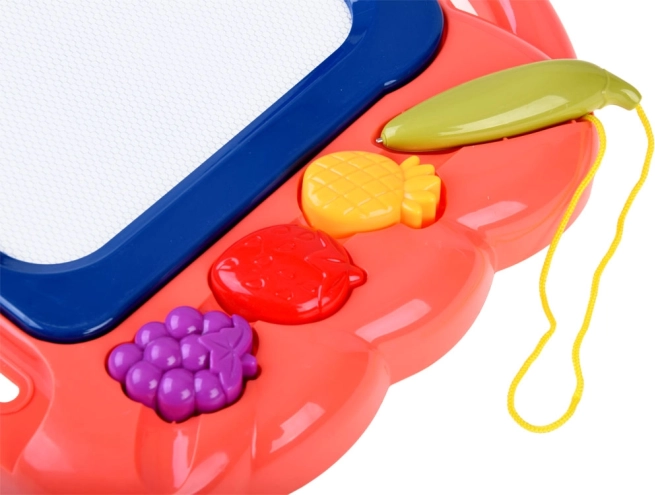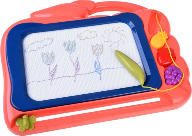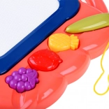 Tato kreativní kreslicí tabulka nabízí barevné pozadí, na kterém děti snadno vykouzlí obrázky pomocí přiloženého pera. Tři razítka ve tvaru ovoce (ananas, jahoda a hrozen) dodají každému výtvoru hravé detaily, rozvíjejí jemnou motoriku a podporují radost z tvoření.