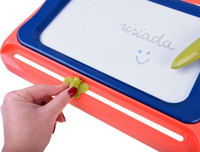 Vymazání je otázkou okamžiku: stačí přejet posuvníkem ve tvaru motýla z jedné strany na druhou a plocha je opět čistá. Kompaktní, lehké a přenosné provedení zajišťuje, že je tabulka skvělým společníkem na cesty, do auta i na dovolenou.