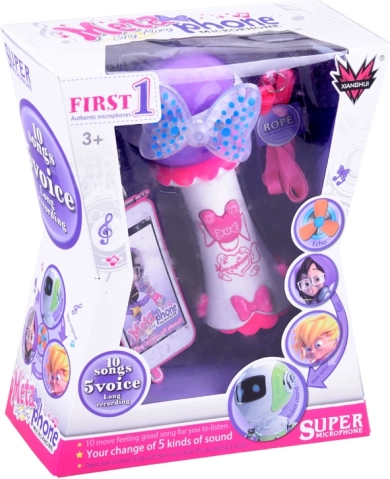 Dětský karaoke mikrofon splní sny malých hvězd o vlastním vystoupení. Nabízí nahrávání a přehrávání, vstup pro MP3, 5 efektů změny hlasu a světelné efekty se svítící mašlí a koulí. Skvělá interaktivní hračka pro zpěv, hudební hry a rozvoj kreativity.