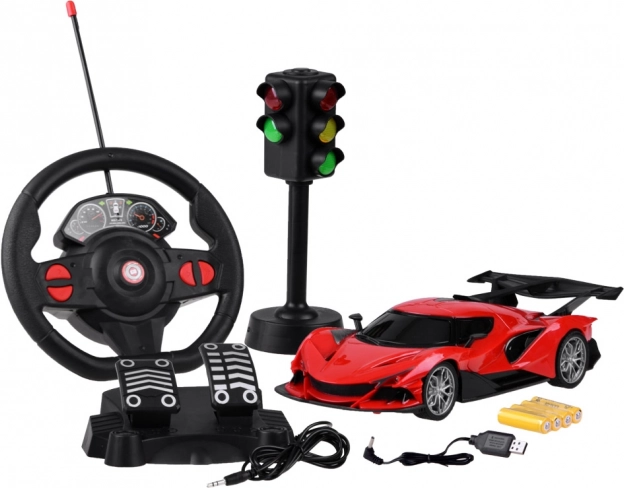 - Kompletní set: auto, volant, pedály, semafor, akumulátor, USB kabel.