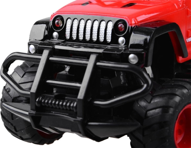 Auto má velké texturované pneumatiky a pevnou ochrannou mřížku, které umožňují pohyb i na nerovných terénech.