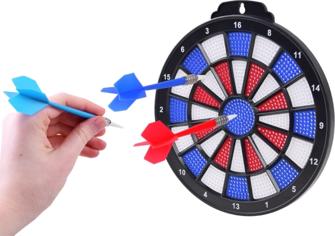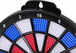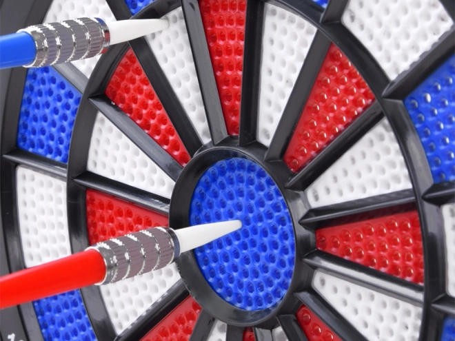 Dartová deska je navržena pro rekreační použití s červenými, modrými a bílými segmenty pro přesné zaměření a skórování.