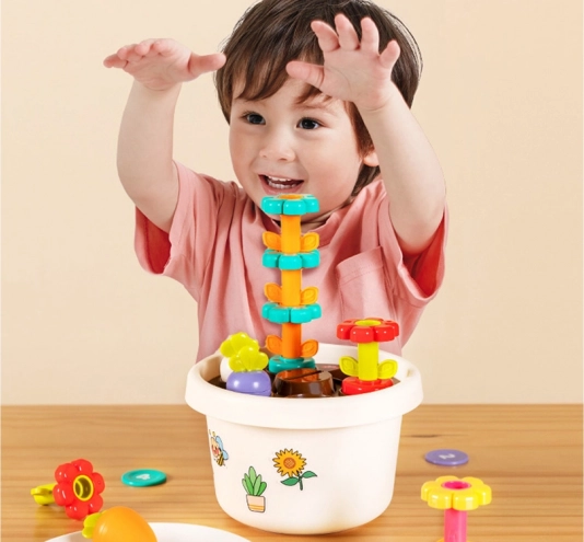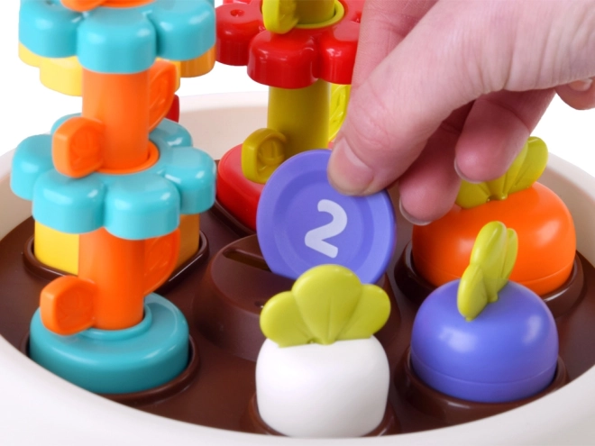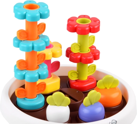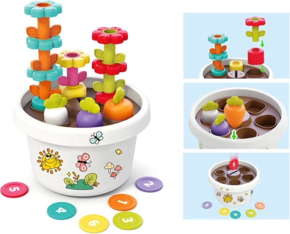 Hračka podporuje jemné motorické schopnosti dítěte díky interaktivním prvkům jako jsou stohovatelné květiny a barevné žetony.