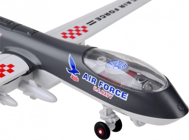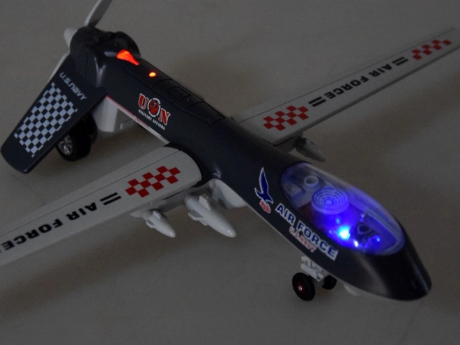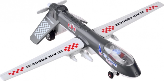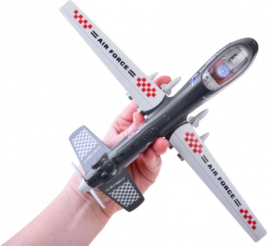 Umístěním hračky na rovný povrch zahájíte zvukové a světelné funkce. Uslyšíte zvuky startu a práce motorů, výstřely, zvuky boje a osvětlí se kabina a ocas. Dron je esteticky zpracován s důrazem na detaily.