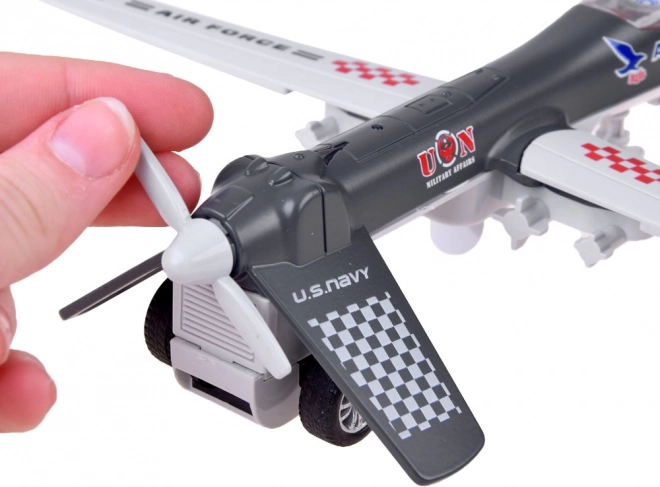Kovový vojenský dron je ideální hračkou pro všechny milovníky vojenské techniky. Tento model je vyroben z kovu a plastu, má skládací křídla a nabízí působivé vizuální a zvukové efekty.