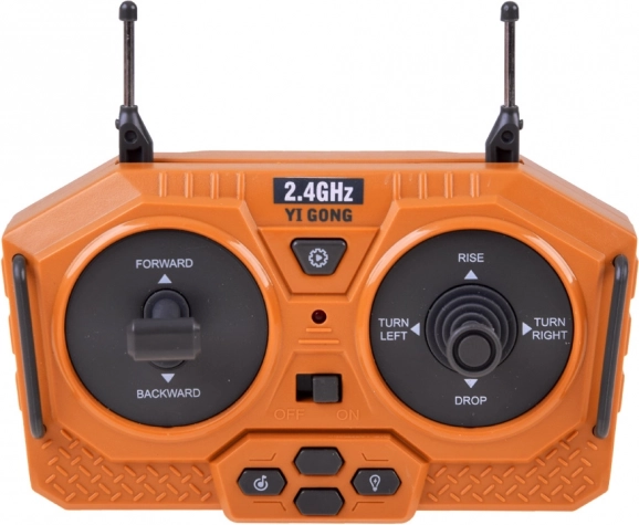 Ovladač umožňuje jízdu vpřed/vzad, zatáčení a zvedání/ spouštění radlice. Funkce demo, vypínání světel a zvuků, pohodlný ergonomický úchop.