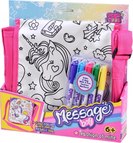 Součástí balení jsou barevné fixy o délce 14 cm (modrá, růžová, fialová, zelená, žlutá), které skvěle kryjí a snadno se vymývají. Taška o rozměrech 23 × 23 × 5 cm je ideální na drobnosti do školy, na kroužky i na výlety.
