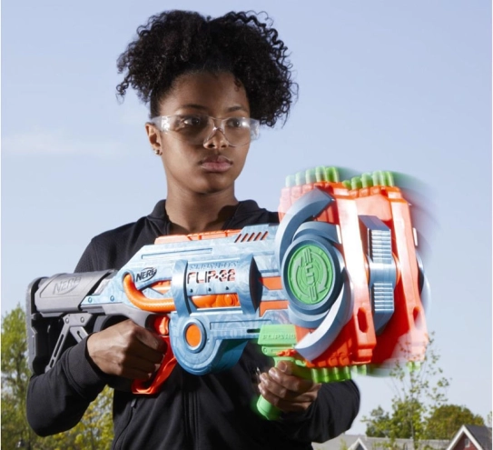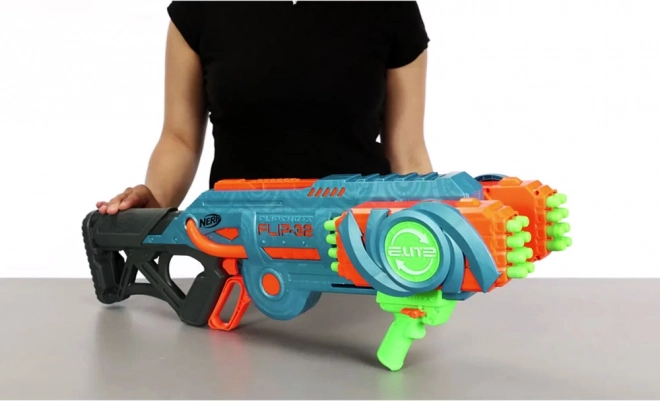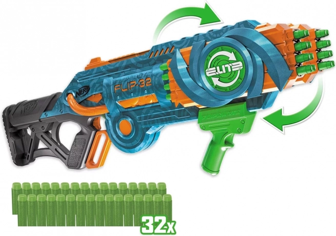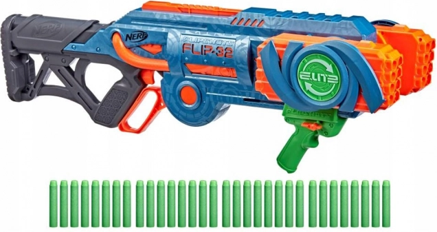 Blaster Nerf Elite 2.0 Flip-32 je vyroben ze kvalitního plastu a střely jsou z bezpečné pěny s gumovými konci. Systém otočných zásobníků umožňuje flexibilitu a pokračování ve hře i po vystřelení první várky střel. Stačí otočit zásobník o 180 stupňů a zábava může pokračovat. Dvě možnosti střelby nabízejí buď jednotlivé vystřelení, nebo dvojitou střelu.