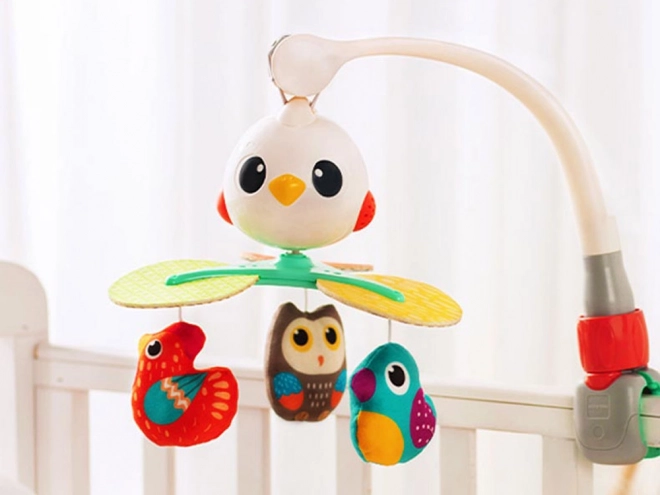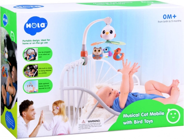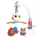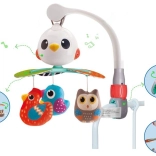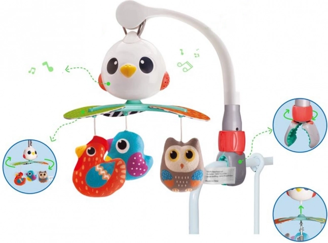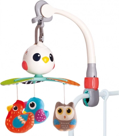Tento nádherný dětský kolotoč je navržen tak, aby stimuloval vizuální, sluchové a hmatové smysly vašeho dítěte. Vyzkoušené písně a příjemné melodie zajistí, že miminko bude spokojeno a uklidněno. Rotující struktura je doplněna závěsnými hračkami ve tvaru pestrobarevných ptáčků, lákajícími k uchopení a dotýkání.