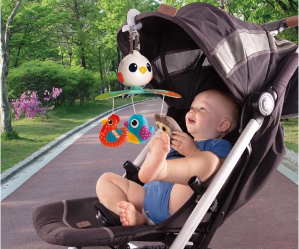 Díky univerzálnímu klipu můžete kolotoč snadno připevnit k různým typům dětského vybavení, jako jsou postýlky nebo kočárky.