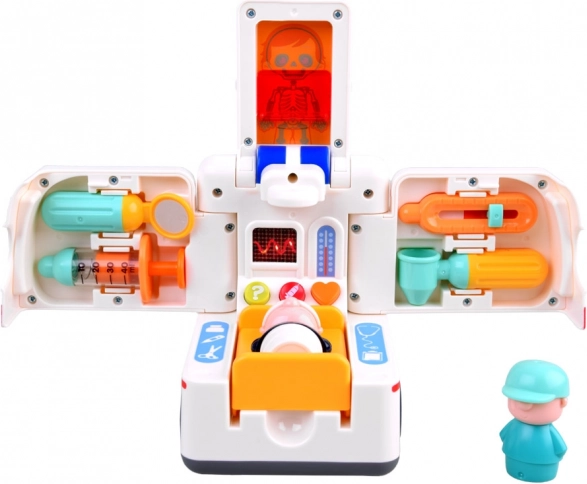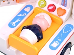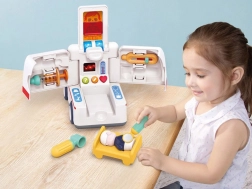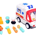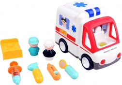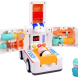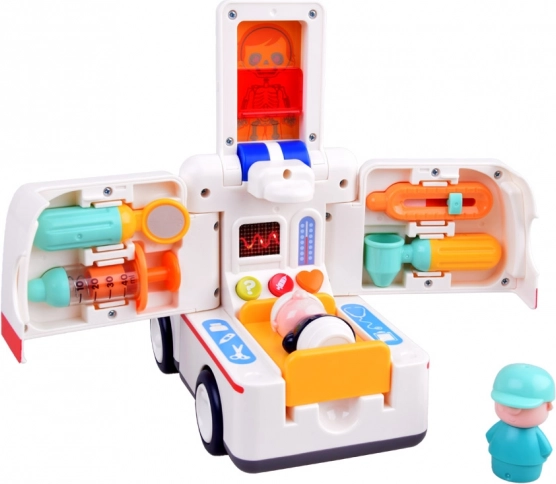 Součástí jsou figurky pacienta a záchranáře/řidiče a praktické nástroje pro vyšetření. Děti si tak mohou přehrát celý zásah od příjezdu přes vyšetření až po převoz na nosítkách. Interaktivní tlačítka se symboly srdce, injekce a otazníku ukrývají zvuky spojené se zdravím, které podporují poznávání a učení hrou.