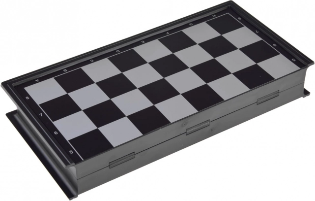 Lehká plastová šachovnice se sklopnou konstrukcí slouží i jako úložný box. Souřadnice po okrajích usnadňují učení a analýzu partií.