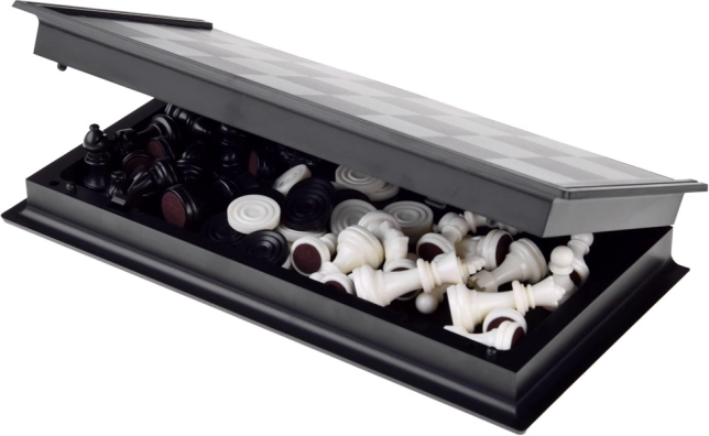 Jedna sada, dvojnásobná zábava. Hrajte klasické šachy nebo dámu, podle chuti a věku hráčů.