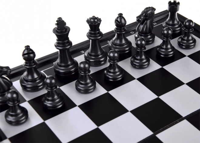 Šachové figury mají integrované magnety, které je udrží na políčkách i při naklonění šachovnice – ideální do auta, vlaku či na piknik.