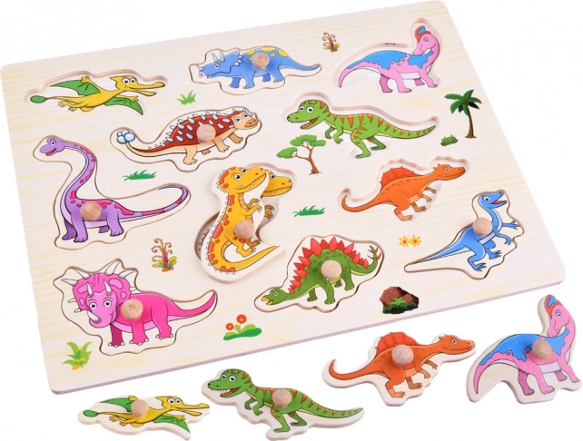 Vkládačka je ideální pro první seznámení s puzzle – pevná dřevěná tabule udržuje všechny díly pohromadě a jasně vymezené tvary vedou k úspěchu. Na desce najdete celkem 11 dinosaurů, mezi nimi oblíbené druhy jako T‑Rex, triceratops či stegosaurus.