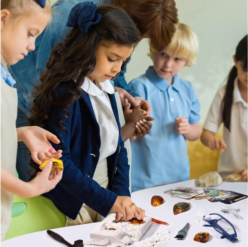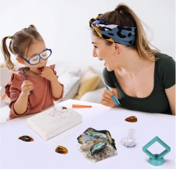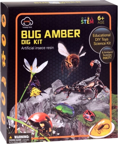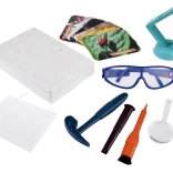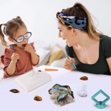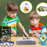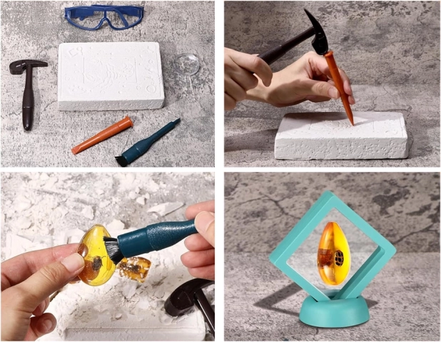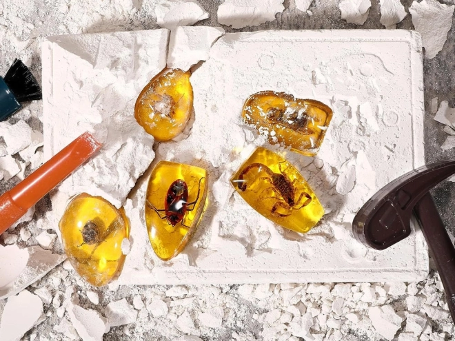 Proměňte dětský pokoj v malé paleontologické pracoviště. V sádrovém odlitku je ukryto 6 „kousků jantaru“ se zataveným hmyzem, které dítě krok za krokem objeví pomocí kladívka, dlátka a štětce. Bezpečnost zajišťují ochranné brýle, pro detailní zkoumání slouží lupa.