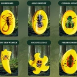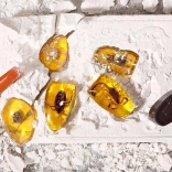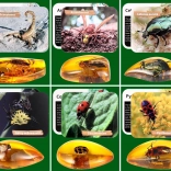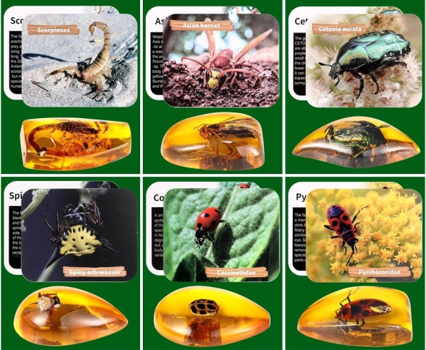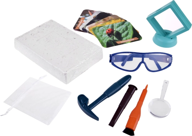 - sádrový odlitek se 6 „jantary“, kladívko, dlátko, štětec, ochranné brýle, lupa, sáček na fosilie, stojánek, 6 karet s hmyzem (EN)
