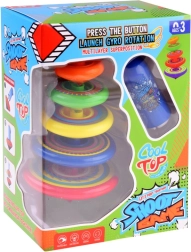 Tato barevná pyramidová sada káč je navržena pro děti různých věkových kategorií. S pomocí praktické rukojeti (launcheru) se káči snadno uvedou do rotace, což zajišťuje plynulý a atraktivní pohyb na stole či podlaze. Hračka podporuje koordinaci oko–ruka, trpělivost a soustředění.