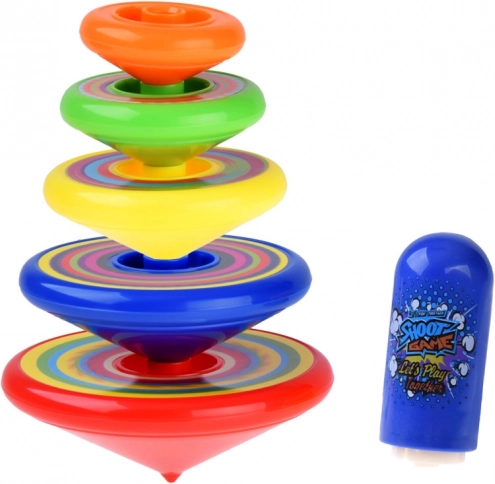 Pět káč různé velikosti láká k soutěžím o nejdelší rotaci i k tvorbě zábavné rotující pyramidy.