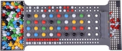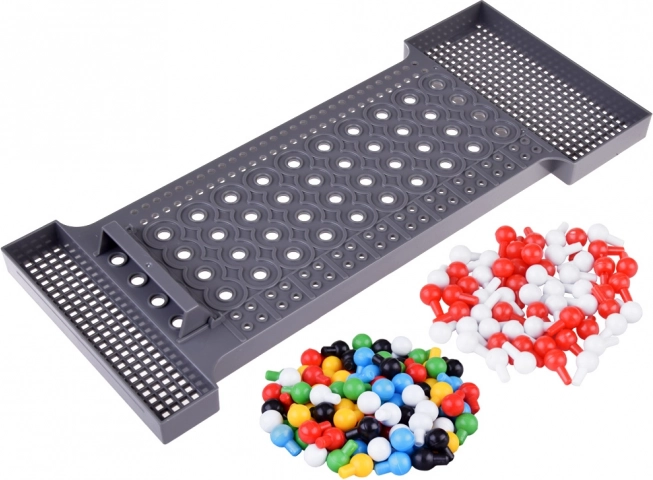 Šedá plastová deska s mřížkou a úložnými přihrádkami udržuje barevné kolíčky vždy po ruce a hru přehlednou.