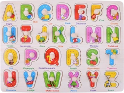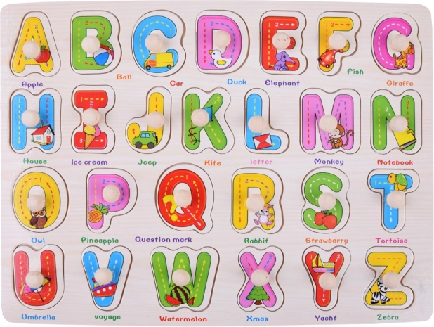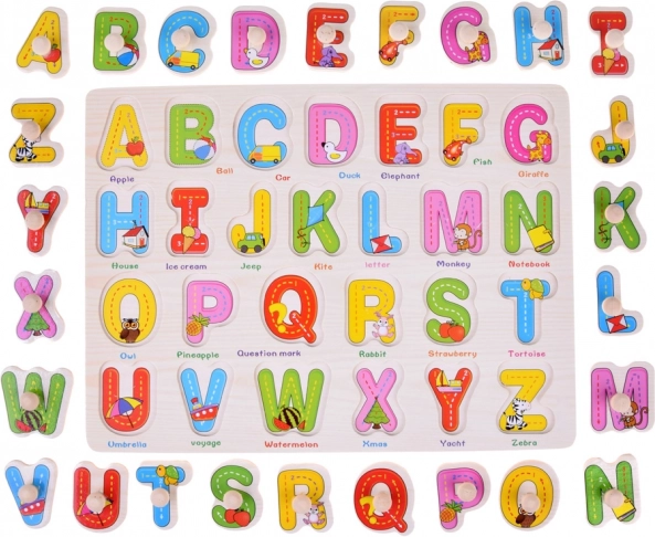 Tato dřevěná abeceda je skvělým pomocníkem při prvním seznamování s písmeny. Velké, barevné dílky s dřevěnými úchytkami se snadno vyjímají a vkládají, což přirozeně rozvíjí koordinaci oko–ruka a jemnou motoriku. Každé písmeno má svůj obrázek a anglické slovíčko (např. A – Apple, B – Ball, R – Rabbit), takže se děti učí písmena i základní slovní zásobu najednou.