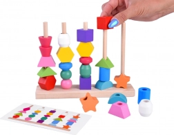Tato všestranná dřevěná hračka nabízí dva způsoby hry: navlékání barevných korálků na šňůrky a skládání tvarů na stojan s pěti kolíky podle předloh. Díky výrazným barvám a rozmanitým geometrickým tvarům přirozeně podporuje rozvoj zraku, hmatu i prostorového vnímání.