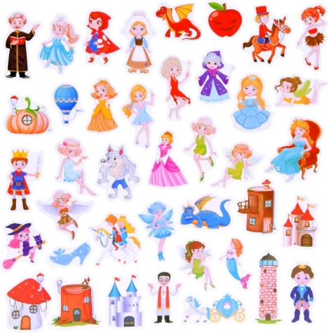 Různorodé samolepky s princeznami, rytíři, draky a zámky podporují kreativitu a nekonečné variace hry.